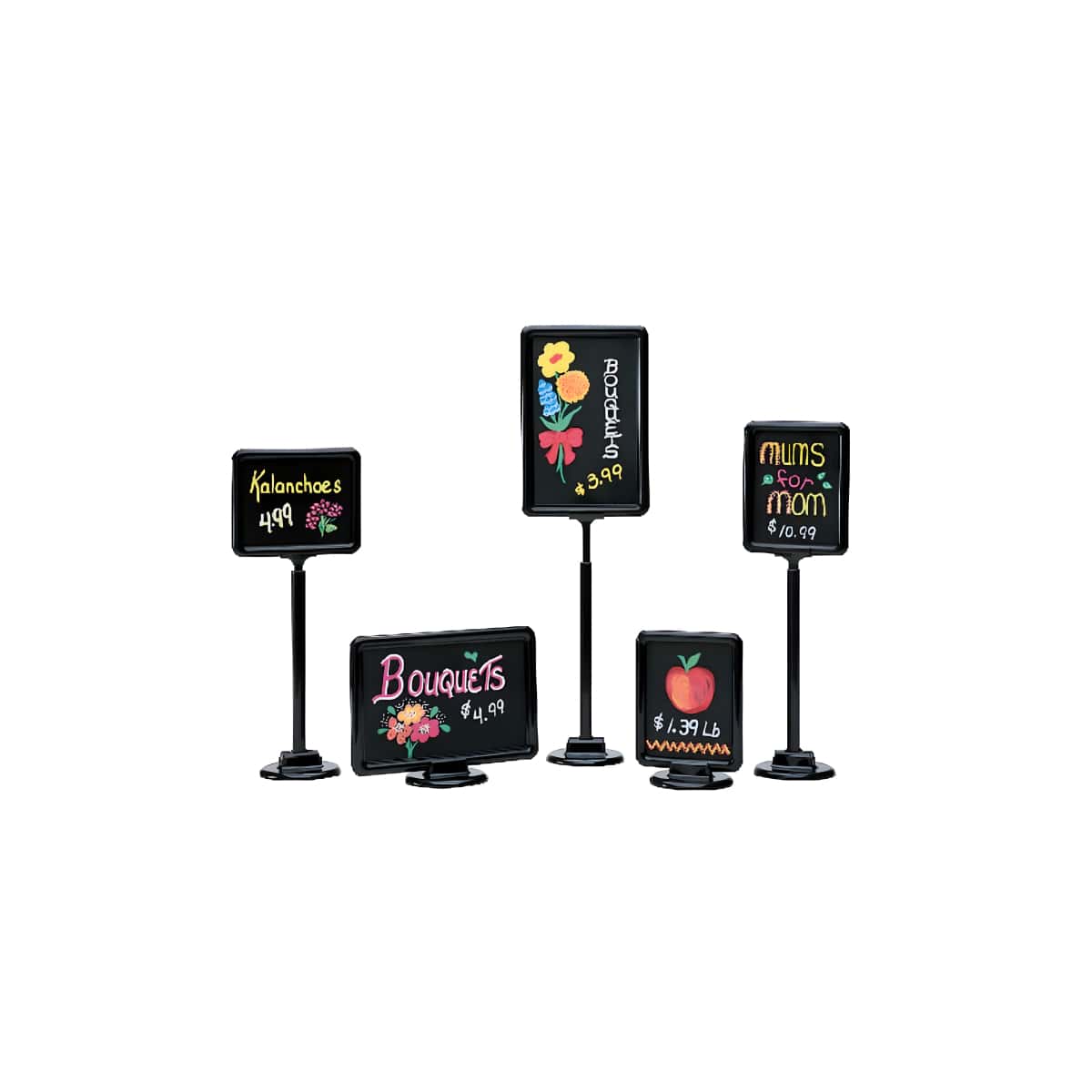 Stem adjusts to 22” high, Shown with optional 2-sided chalkboard inserts.